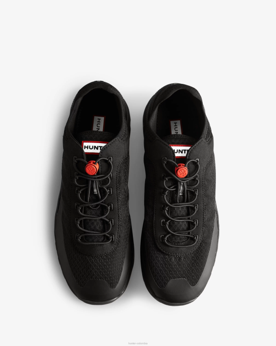una zapatilla urbana informal con un atractivo deportivo de lujo, Hunter's La zapatilla de viaje está confeccionada con una doble capa suave y transpirable de malla y nailon 100% reciclado. La entresuela de EVA reciclada, liviana y absorbente de impactos, y la plantilla de ortholite reciclada garantizan una comodidad superior y un uso flexible, mientras que la suela de goma duradera con certificación FSC brinda agarre adicional para todos los terrenos. Una línea de protección de goma de TPU súper liviana agrega un nivel adicional de protección contra la lluvia. Esta zapatilla negra para hombre está rematada con una lengüeta con el logo tricolor característico de Hunter en la parte posterior para facilitar el calce.