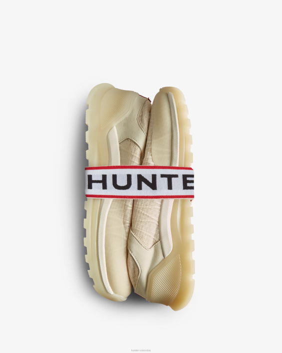 una zapatilla urbana informal con un atractivo deportivo de lujo, la zapatilla de viaje Hunter está confeccionada con una doble capa suave y transpirable de Nylon y malla 100% reciclados. La entresuela de EVA reciclada, liviana y absorbente de impactos, y la plantilla de ortholite reciclada garantizan una comodidad superior y un uso flexible, mientras que la suela de goma duradera con certificación FSC brinda agarre adicional para todos los terrenos. Una línea de protección de goma de TPU súper liviana agrega un nivel adicional de protección contra la lluvia. Esta zapatilla blanca para mujer está rematada con una lengüeta con el logo tricolor característico de Hunter en la parte posterior para facilitar el calce.